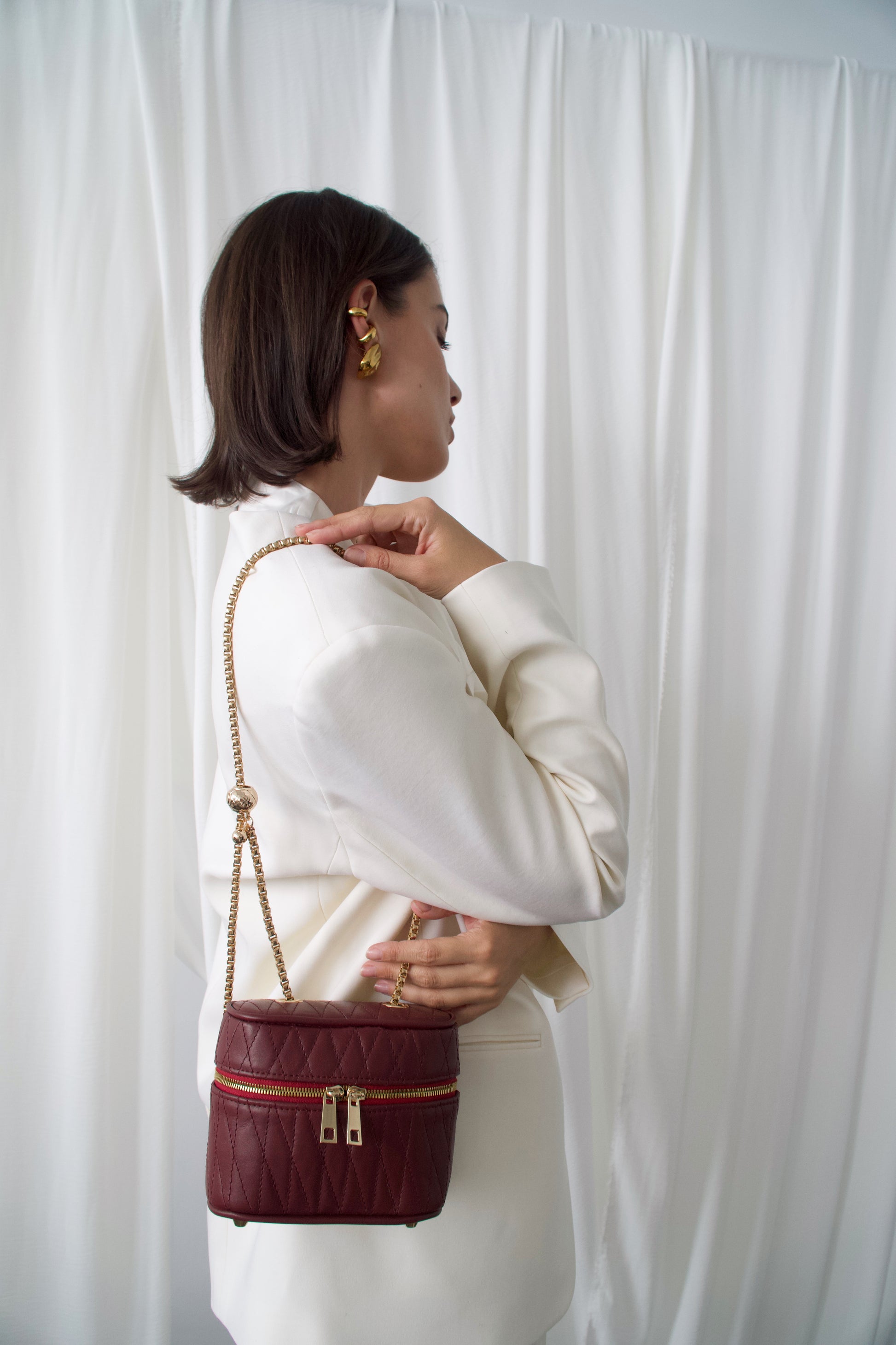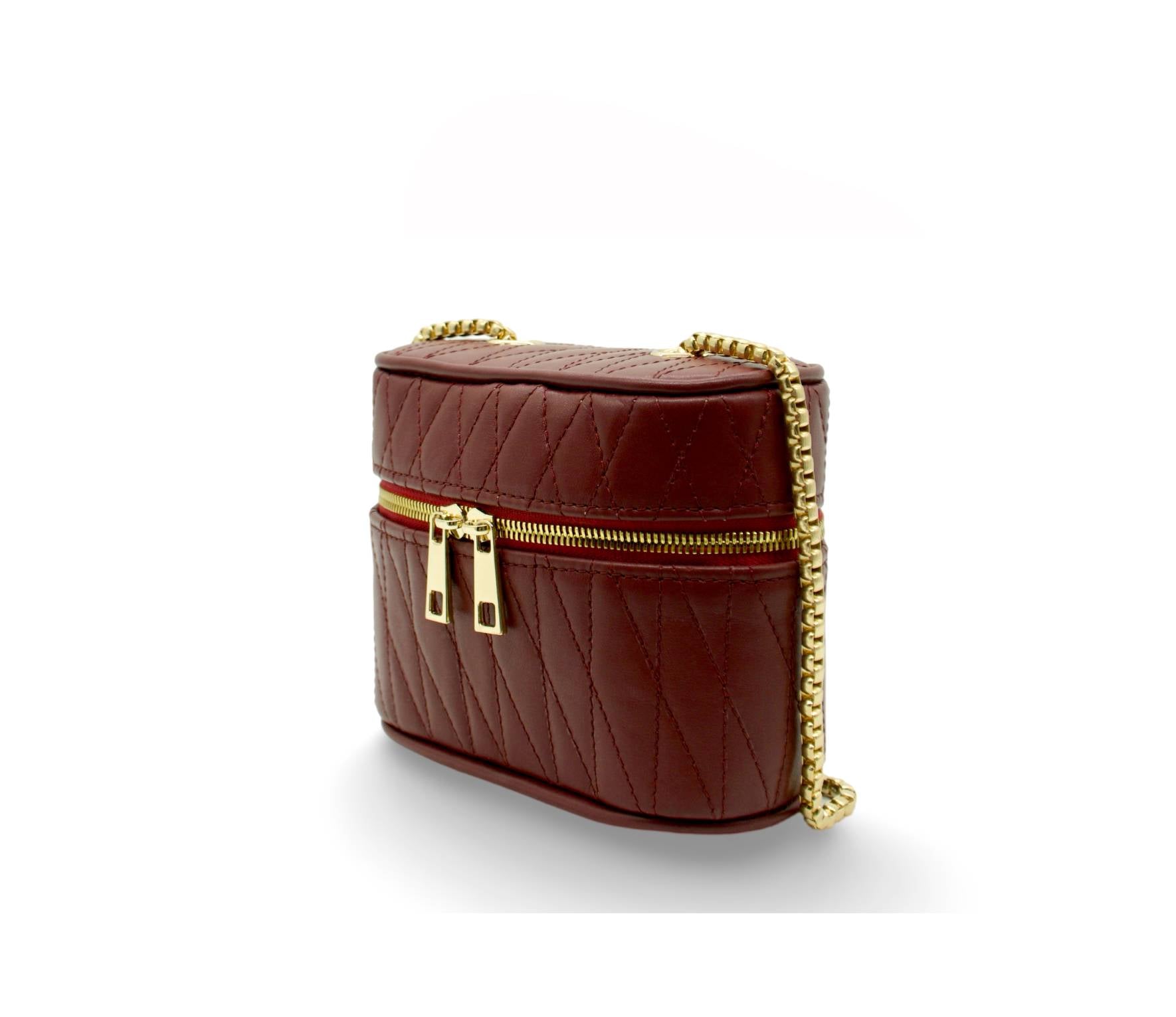 Chic and timeless, this quilted leather box bag is the perfect blend of sophistication and functionality. Crafted from premium leather in a rich, deep hue, it features an intricate diamond-stitched design that exudes elegance. The structured silhouette is complemented by gleaming gold-tone hardware, including a luxurious double-zip closure and an adjustable chain strap for versatile styling—wear it as a crossbody or a shoulder bag.
