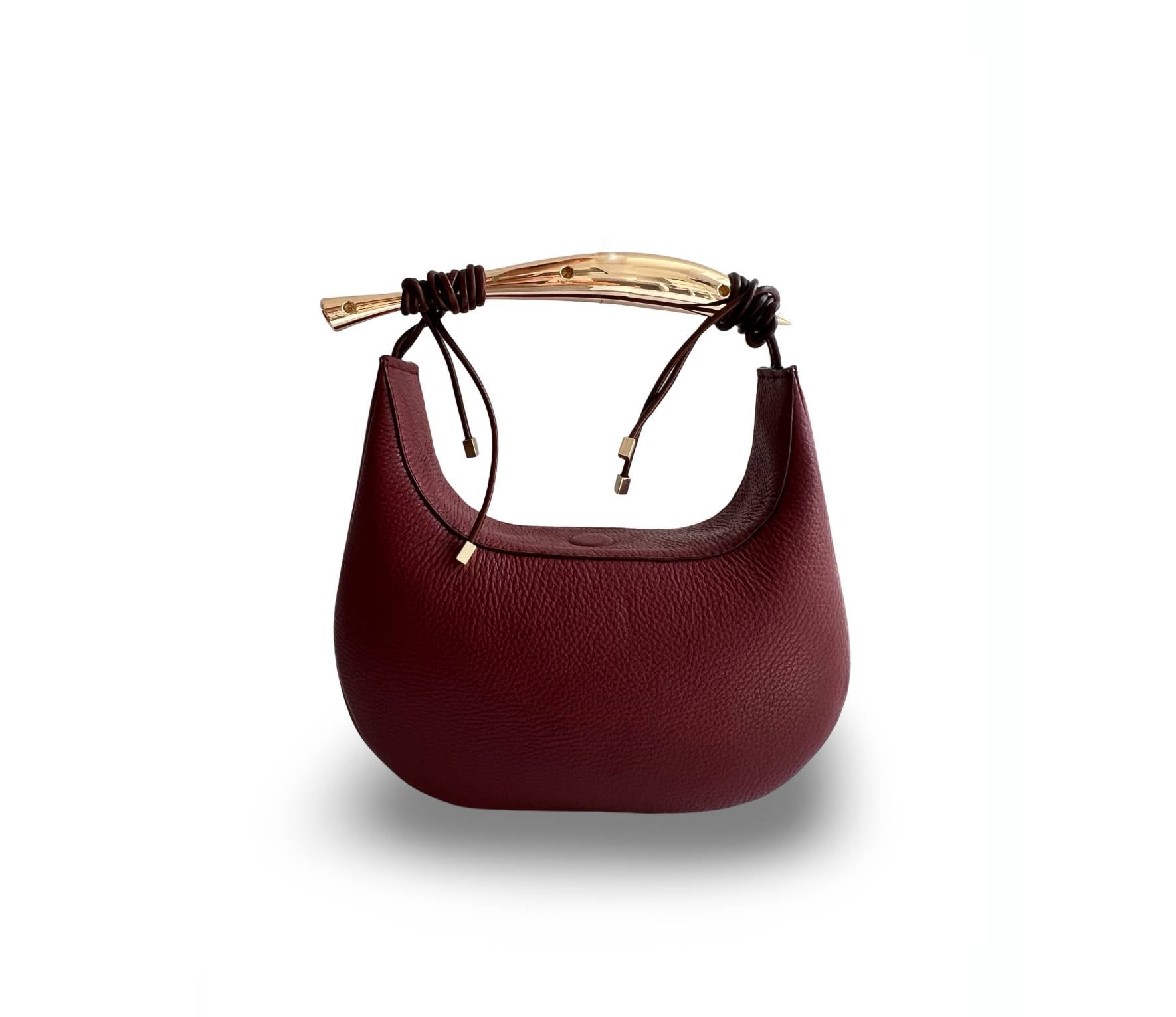 The Coral bag features a minimalist, crescent-shaped silhouette that is both chic and functional. Its compact yet spacious interior is perfect for carrying your daily essentials, making it an ideal accessory for any occasion. Designed with a discreet, invisible magnetic closure, the bag offers a seamless and secure way to keep your belongings safe while maintaining its sleek profile. Adorned with a striking gold handle, this bag exudes a touch of opulence. The gold hardware not only enhances its aesthetic appeal but also adds a unique and modern twist to the classic design. The handle is complemented by stylish knotted accents, adding an element of artisanal craftsmanship.