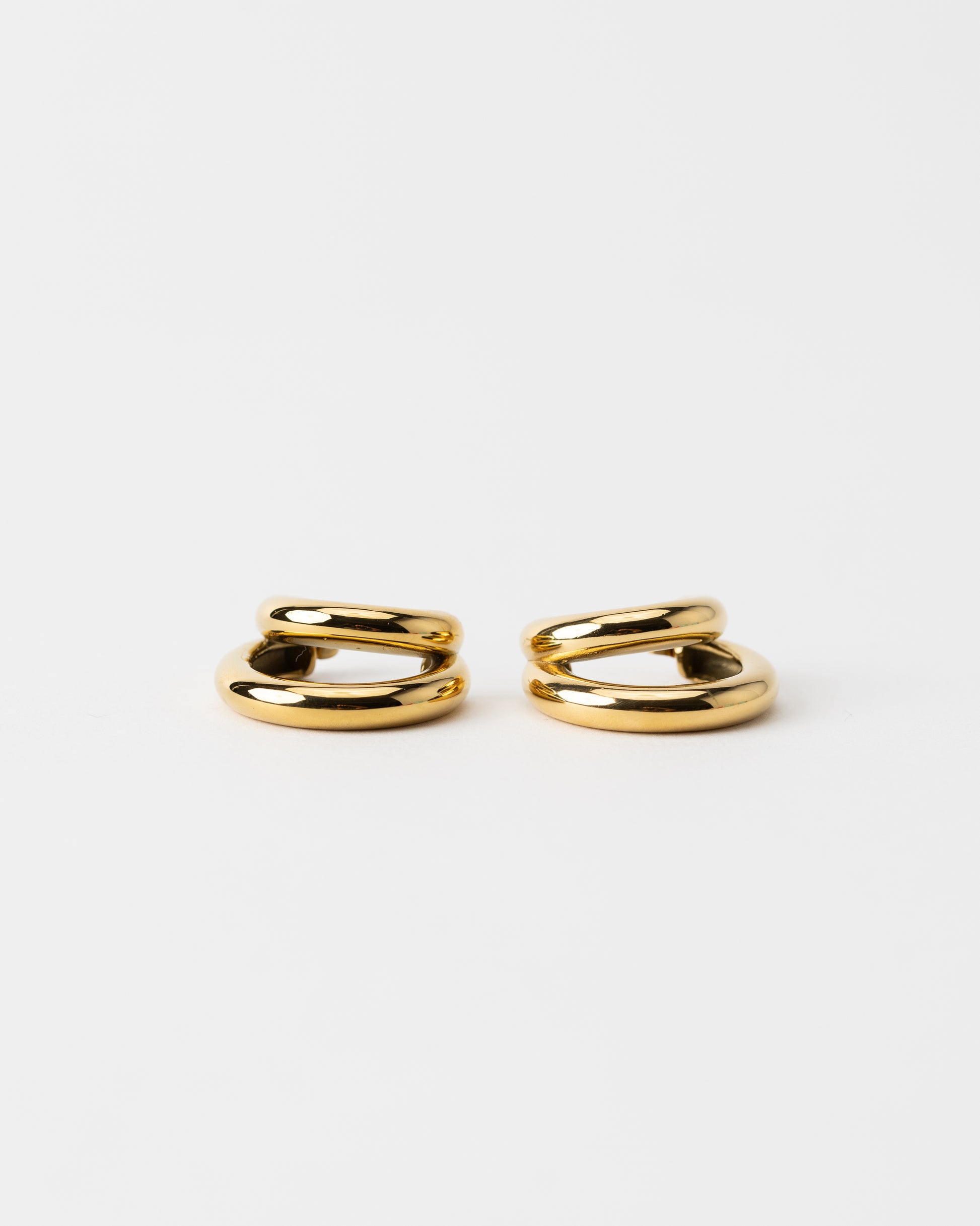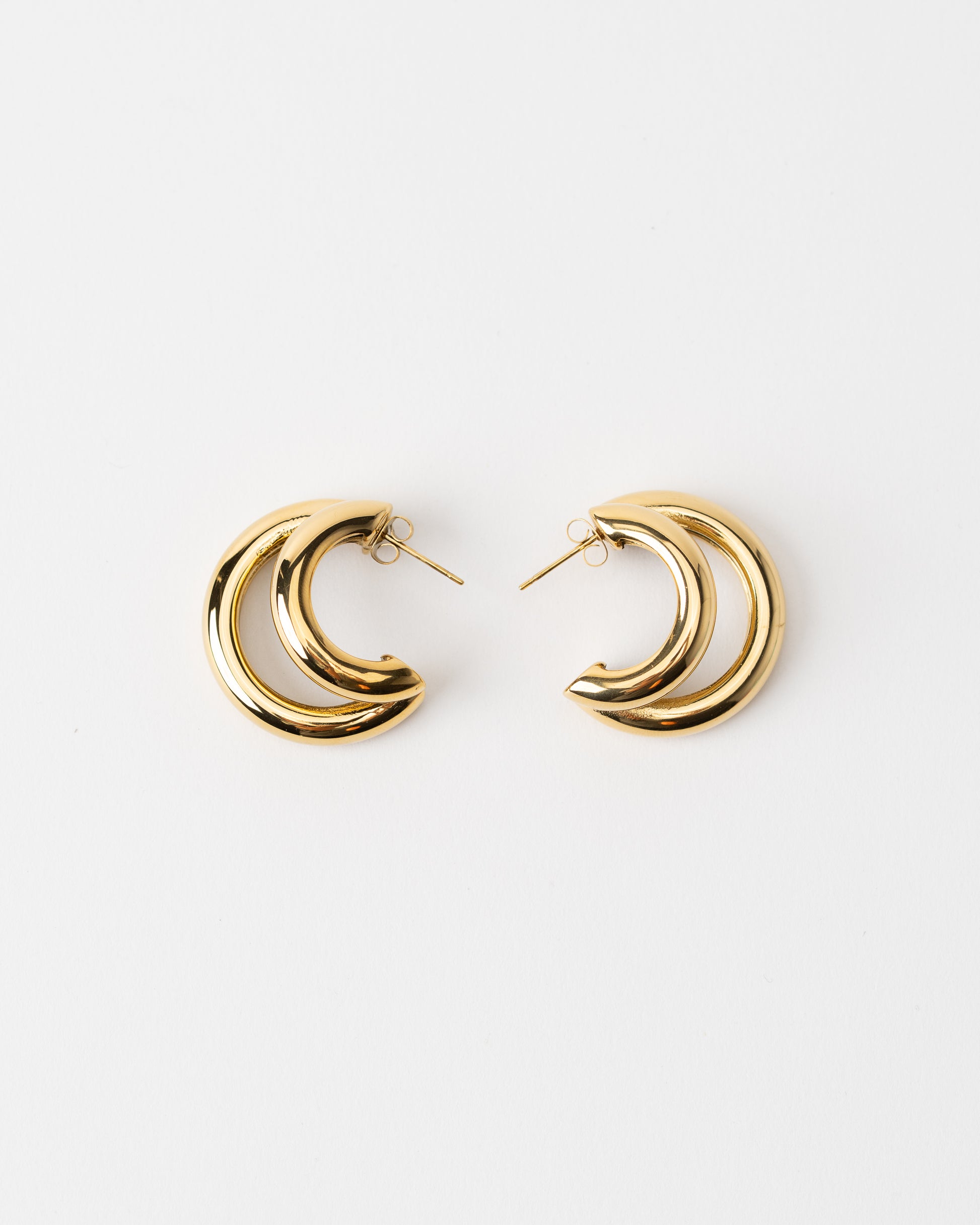 These bold hoop earrings feature a modern sculptural twist, with fluid, crescent-like curves that add depth and movement to a timeless silhouette. Their polished surface catches the light beautifully, making them a versatile statement piece for both day and evening wear. Crafted in stainless steel with 18k gold plating, they are antivernish and waterproof, designed to maintain their brilliance over time.