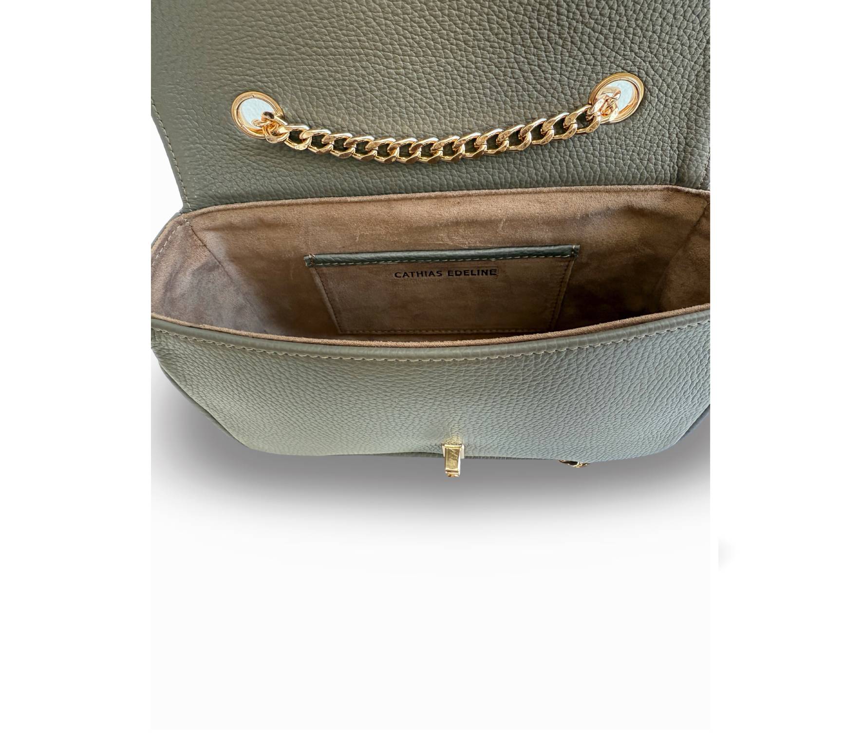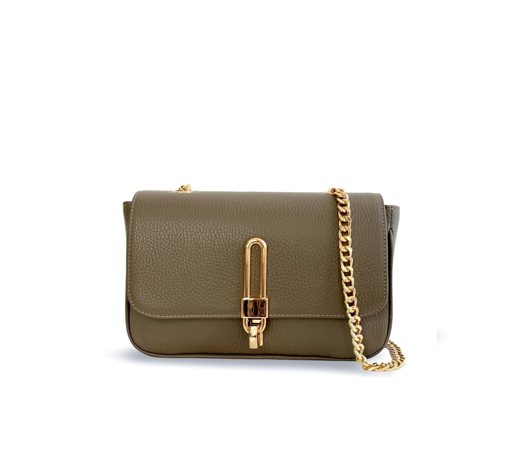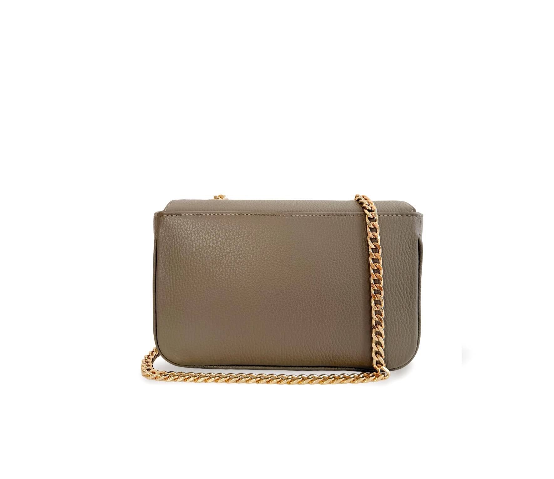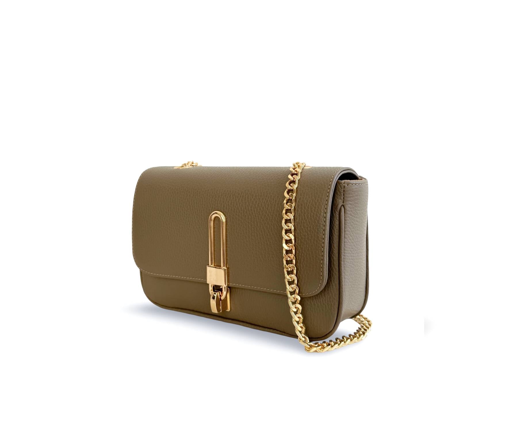 Elevate your style with this elegant crossbody IT-bag crafted from premium pebbled leather in a versatile, earthy taupe color. This compact yet spacious bag combines a timeless silhouette with modern sophistication, perfect for day-to-night wear. It features a luxurious gold-toned chain strap, adding a touch of glamour, and a unique gold metal clasp that secures the front flap for added elegance. The thoughtfully designed interior offers ample space to carry essentials while keeping them easily accessible, also it has convenient pocket that provides extra organization for your essentials, making it as practical as it is stylish.