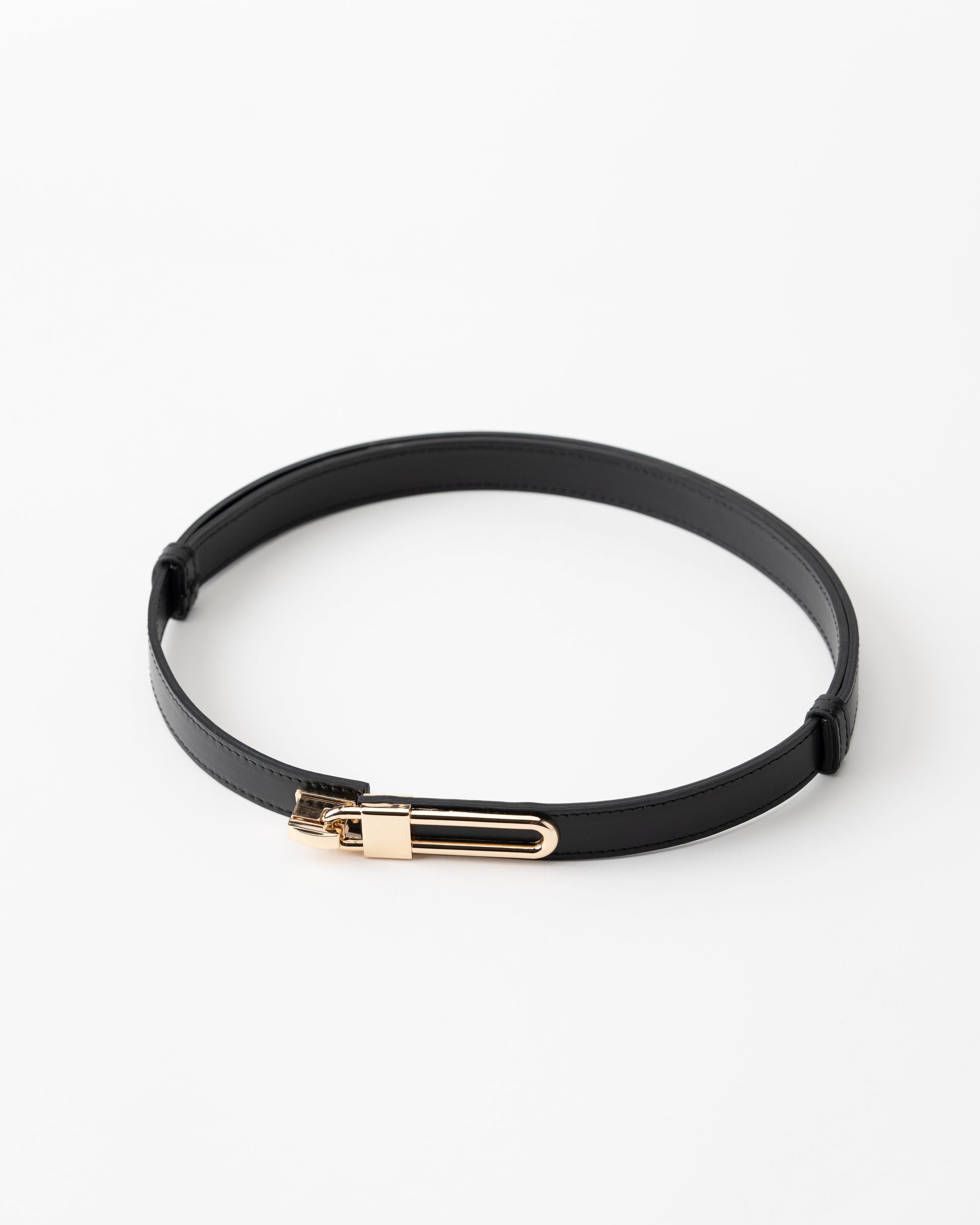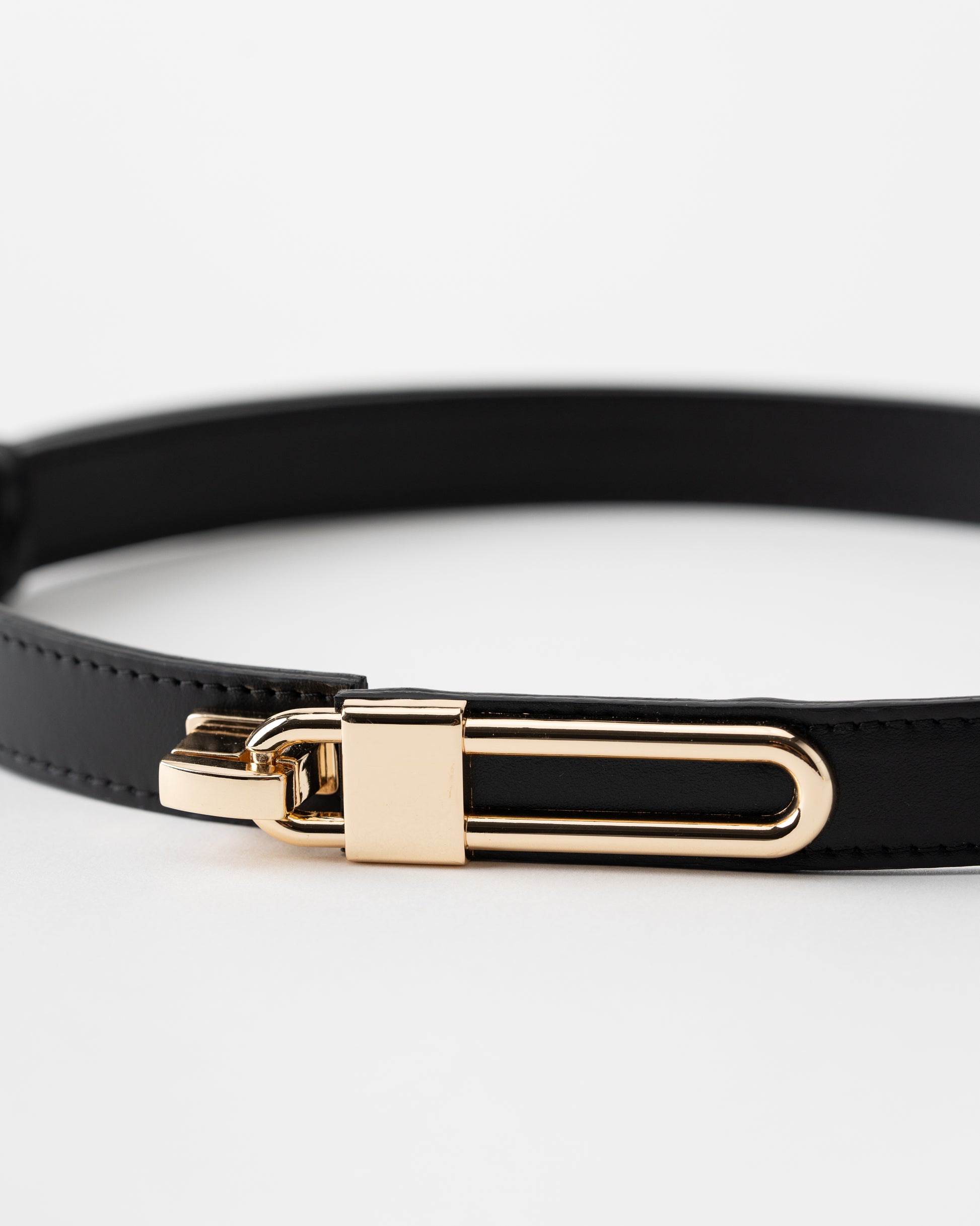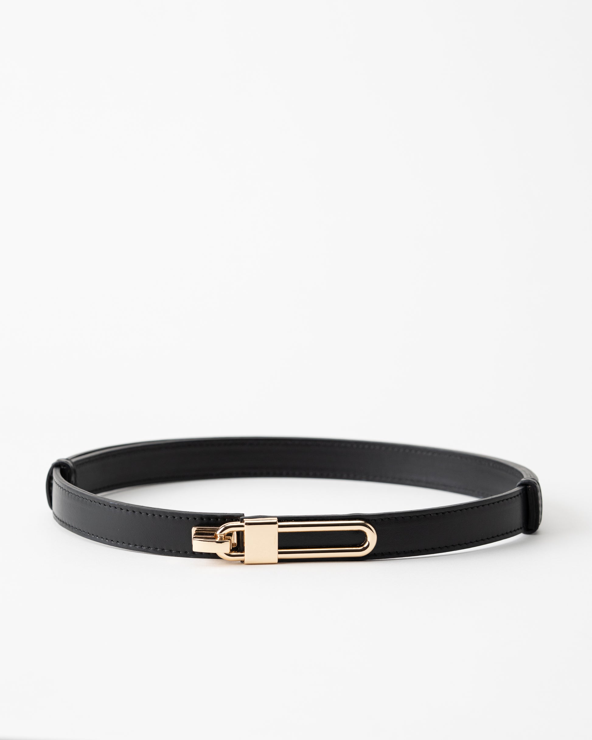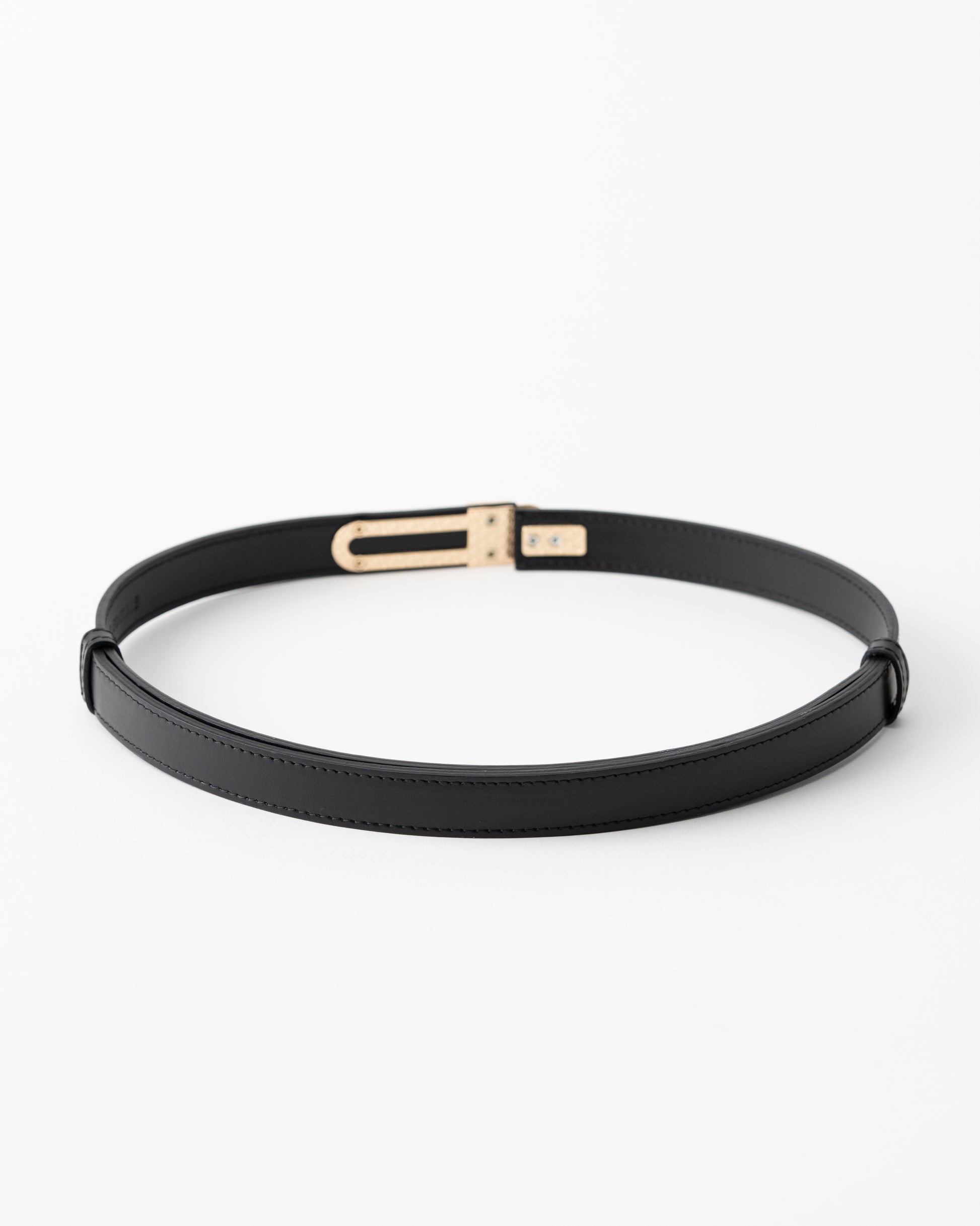 Add a touch of refinement to any outfit with this sleek leather belt. Crafted from high-quality black leather, this belt is designed to bring sophistication and elegance to your wardrobe. The standout feature is the unique gold-tone clasp, which mirrors a modern, minimalist design while providing secure and stylish closure. This versatile accessory is perfect for both casual and formal wear, adding an effortless luxury touch to jeans, trousers, or dresses.