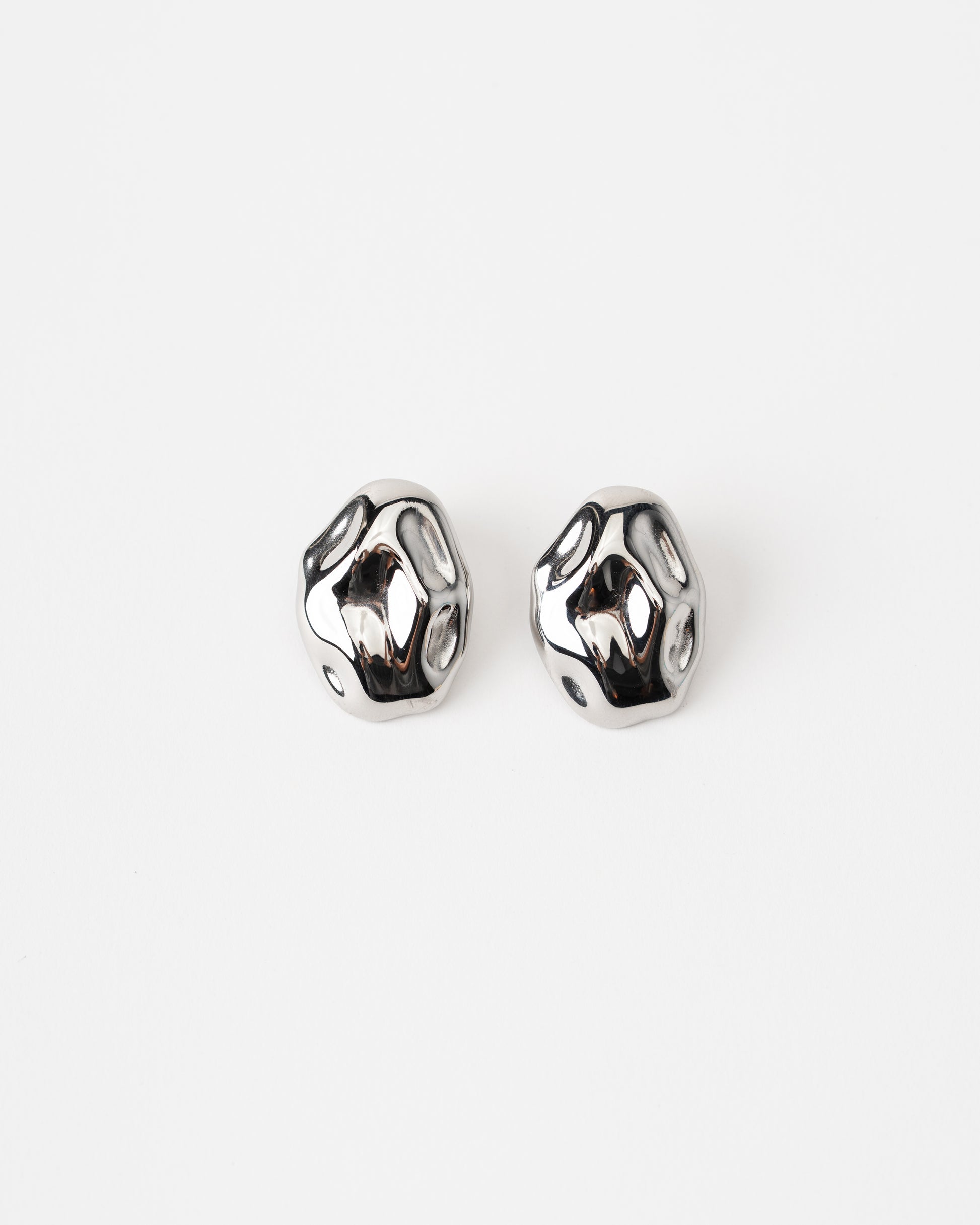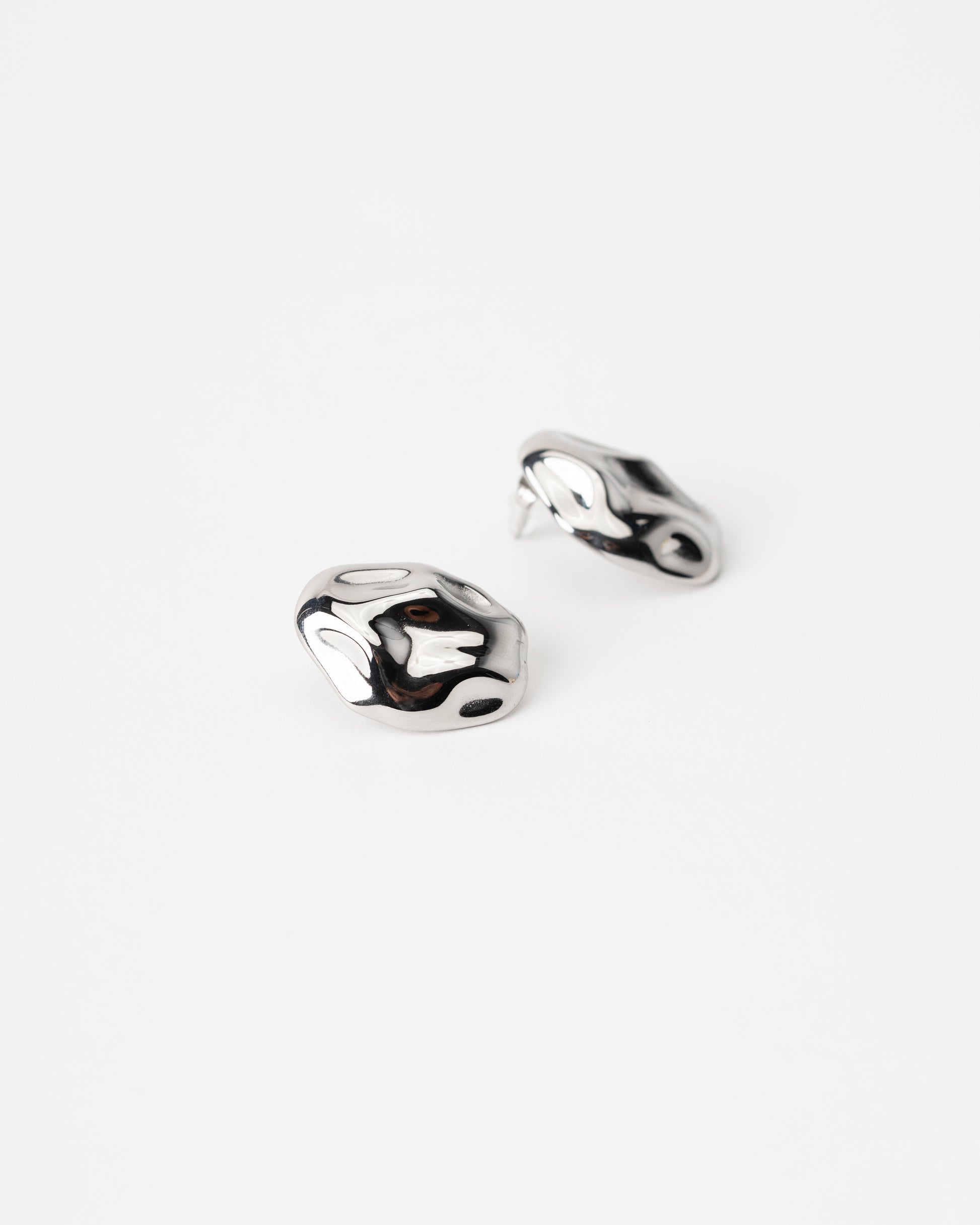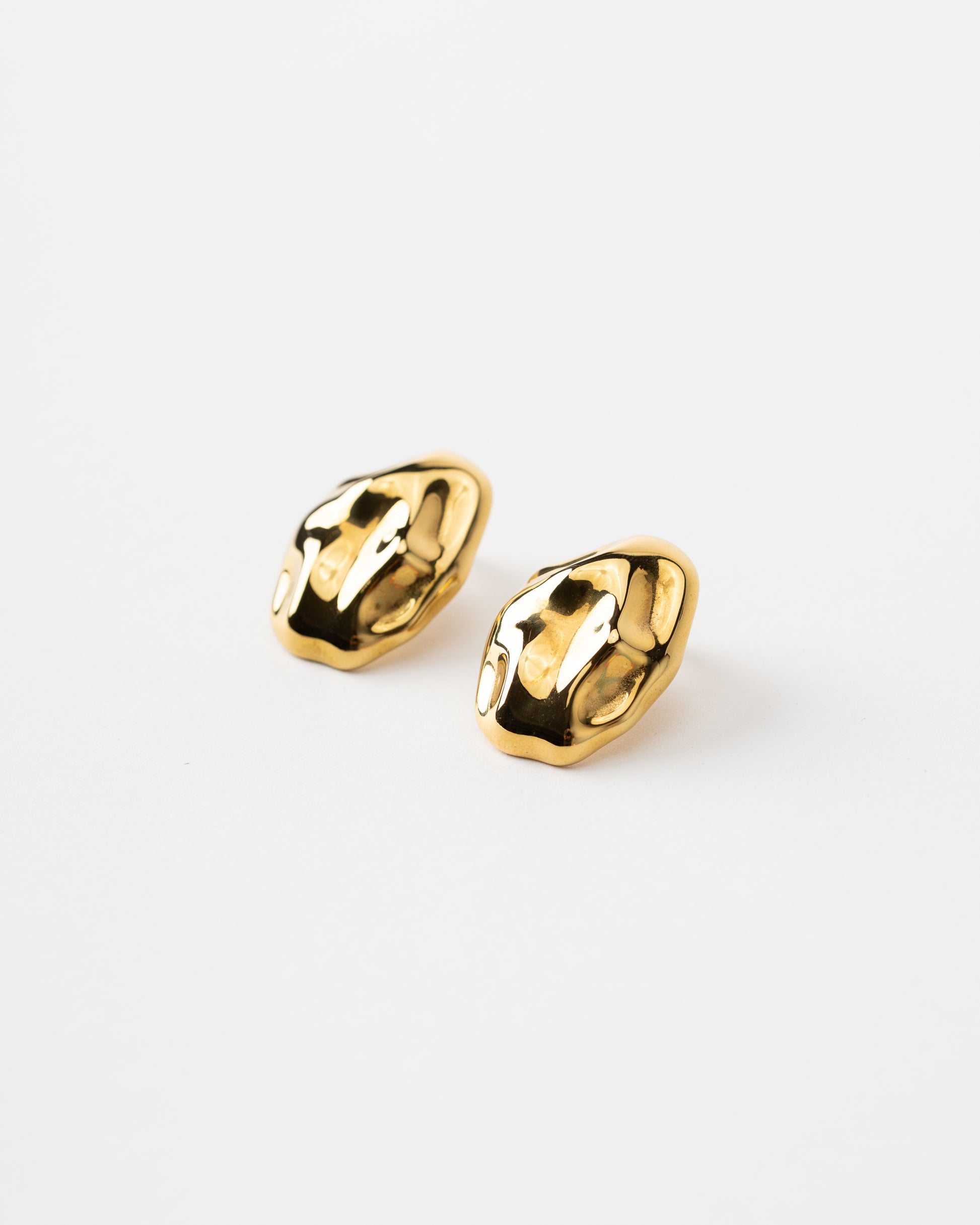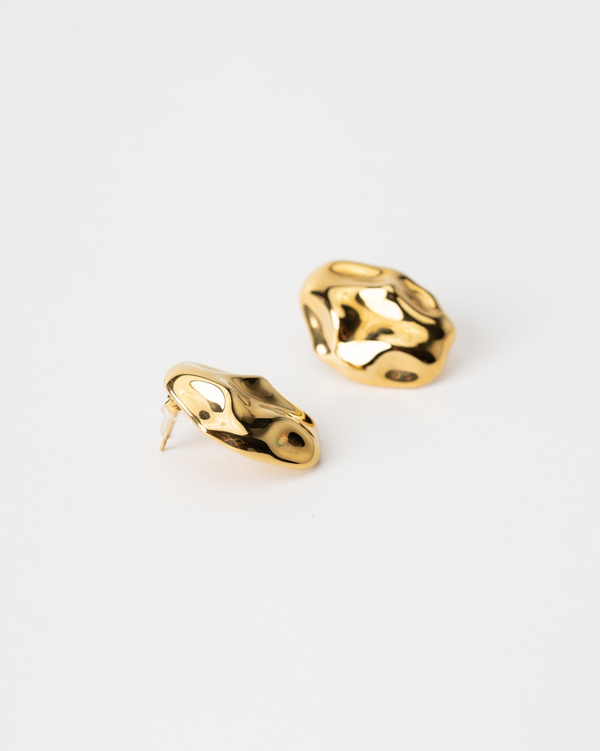 With their unique, organic silhouette, these stud earrings resemble sculpted pebbles shaped by nature. Their polished surface creates a play of reflections, giving them a bold yet sophisticated presence. Crafted in stainless steel with 18k gold plating, they are antivernish and waterproof, designed to last while retaining their shine.