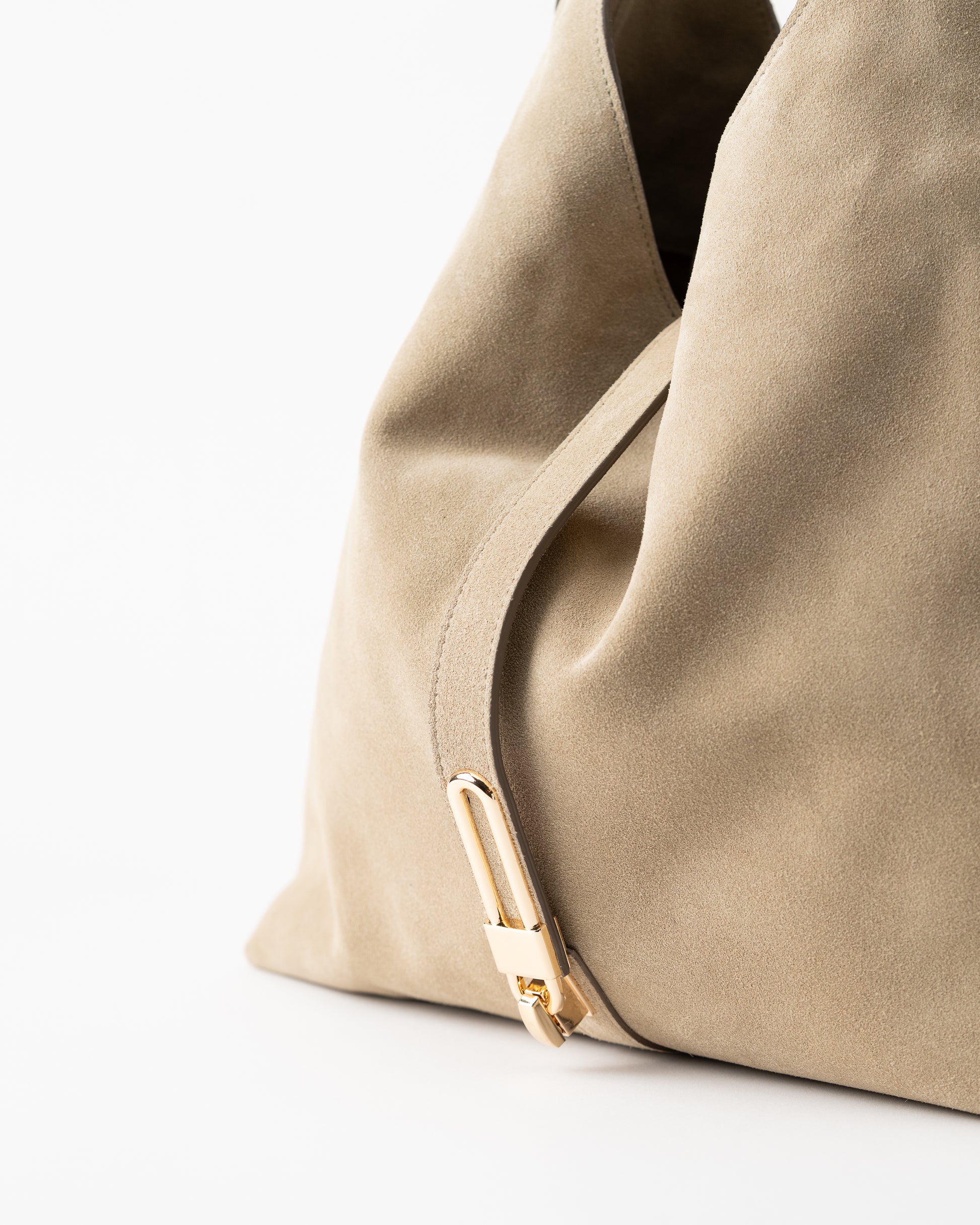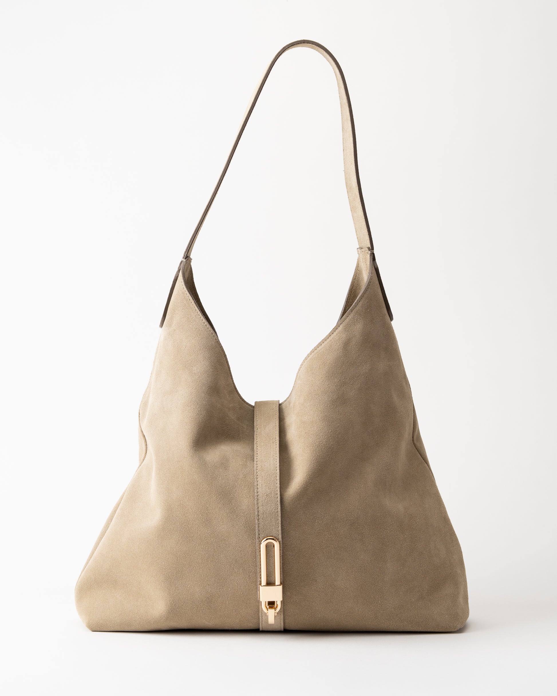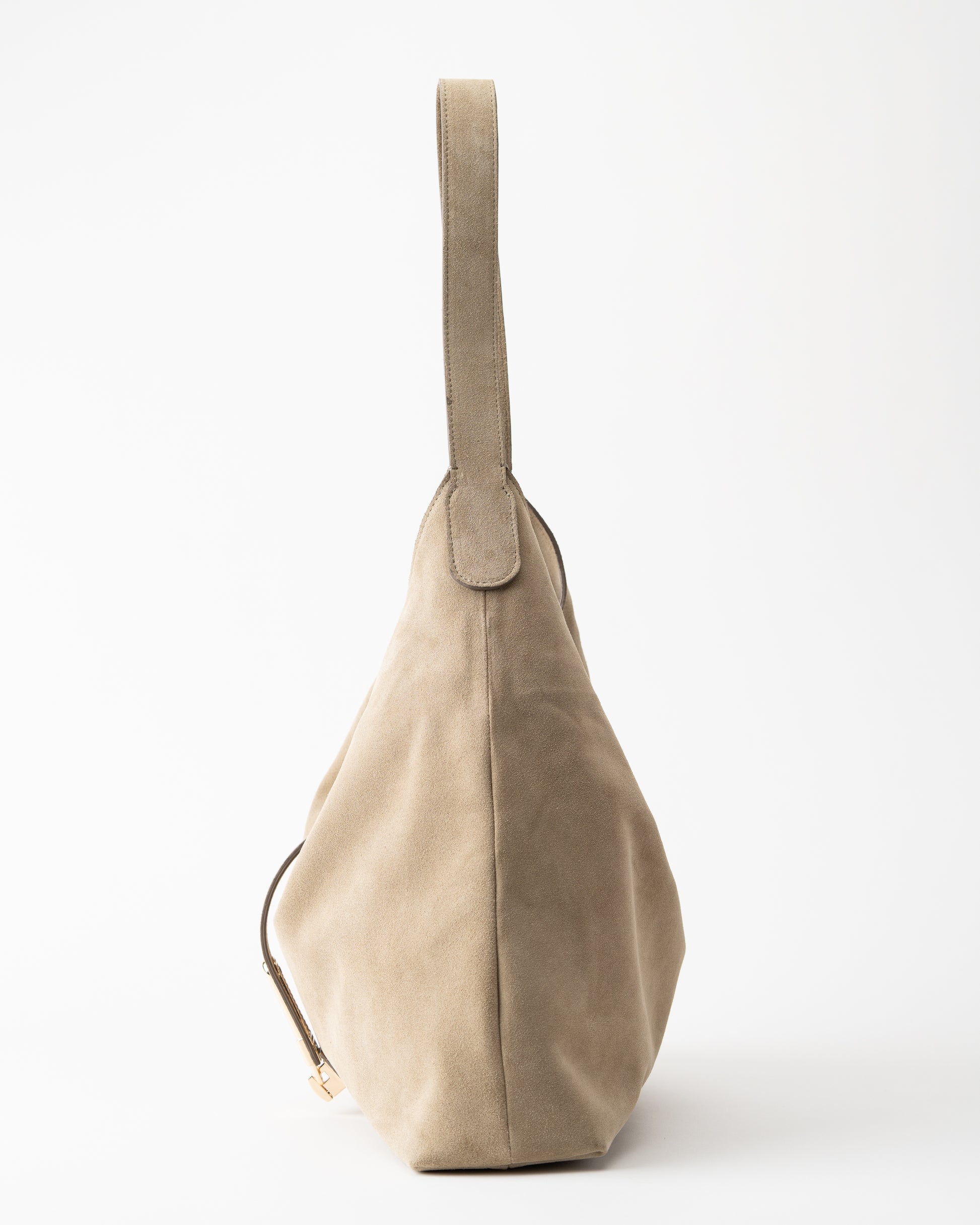 Structura elegantă se întâlnește adesea cu eleganța atemporală în această geantă hobo din piele întoarsă, concepută cu o siluetă fluidă care se așază fără efort pe umăr. Bareta frontală minimalistă, cu o încuietoare aurie lustruită, adaugă o notă de rafinament, în timp ce interiorul spațios asigură caracterul practic pentru utilizarea de zi cu zi.