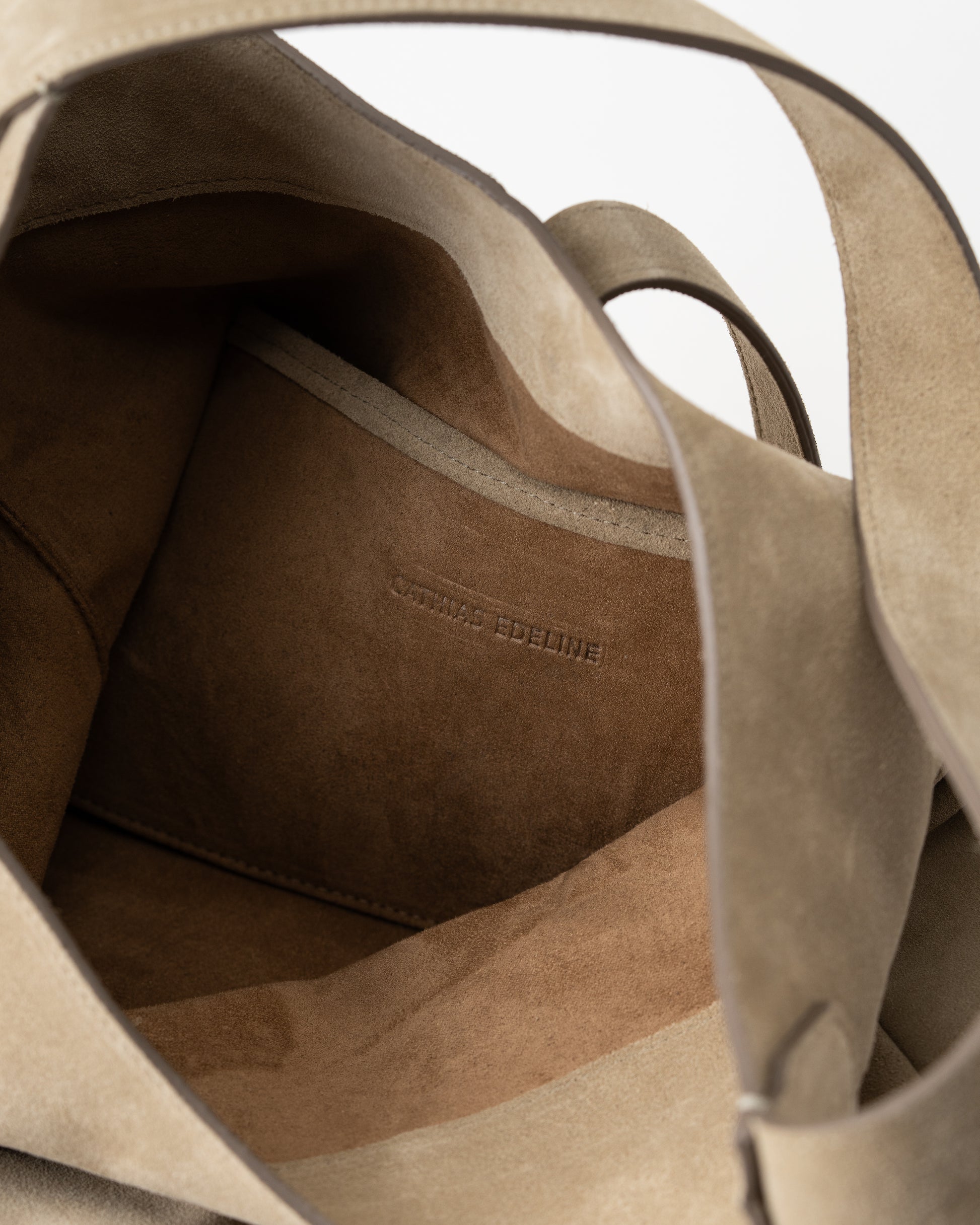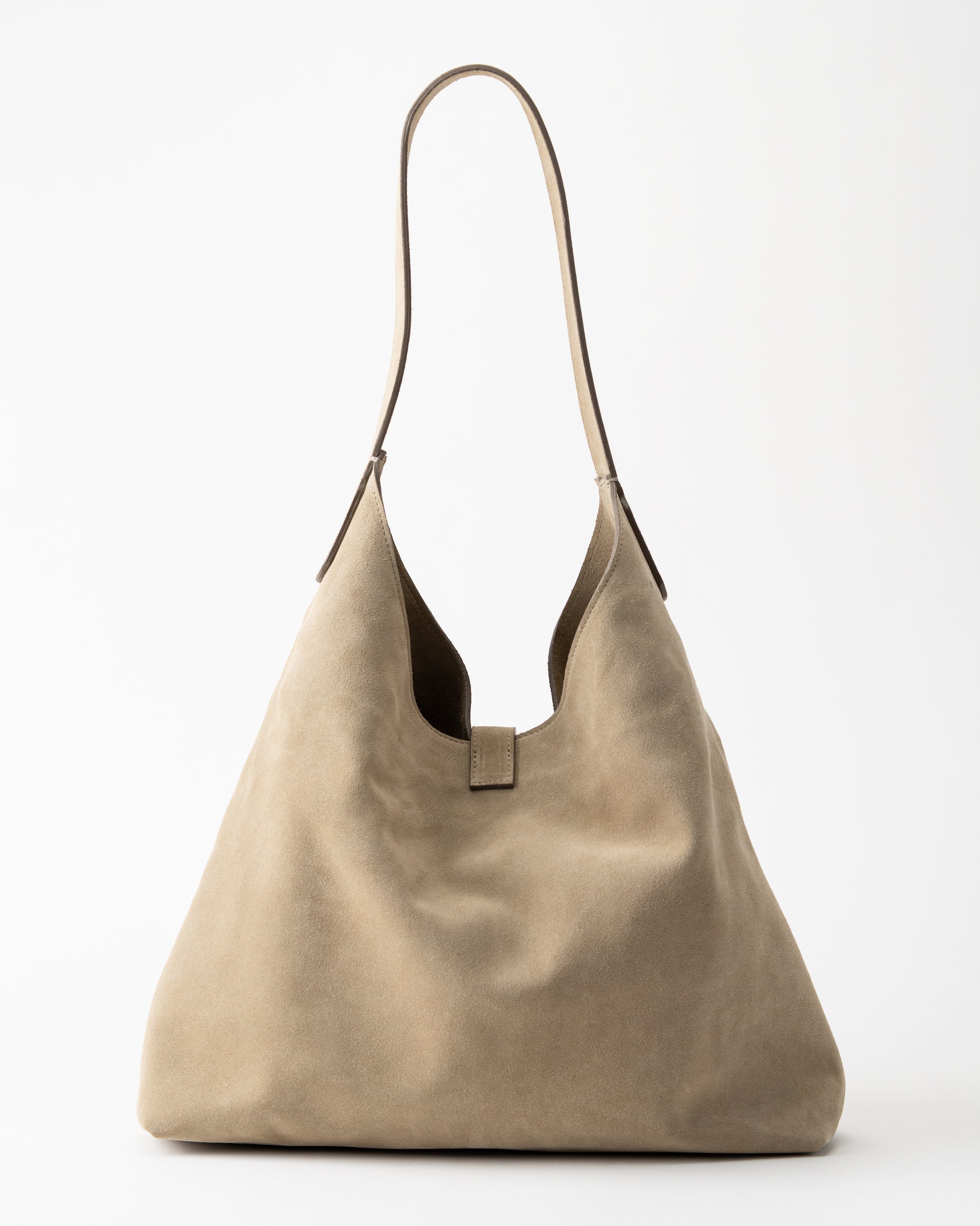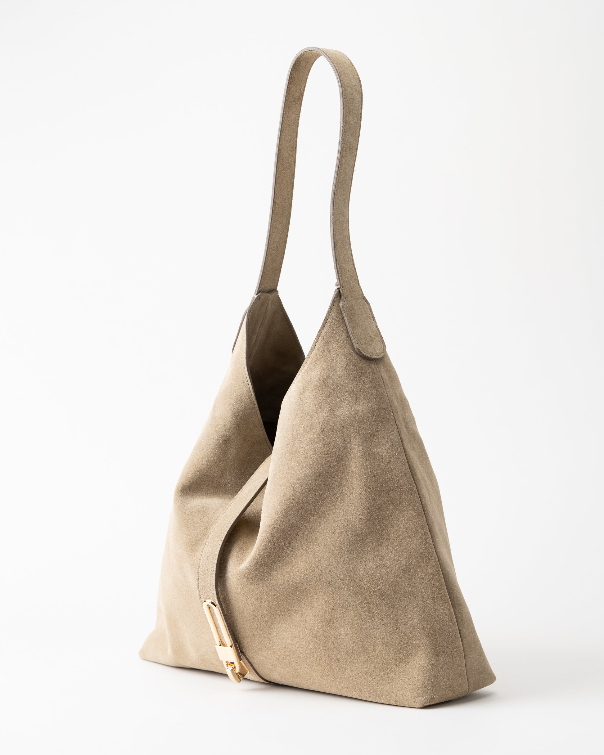 Structura elegantă se întâlnește adesea cu eleganța atemporală în această geantă hobo din piele întoarsă, concepută cu o siluetă fluidă care se așază fără efort pe umăr. Bareta frontală minimalistă, cu o încuietoare aurie lustruită, adaugă o notă de rafinament, în timp ce interiorul spațios asigură caracterul practic pentru utilizarea de zi cu zi.