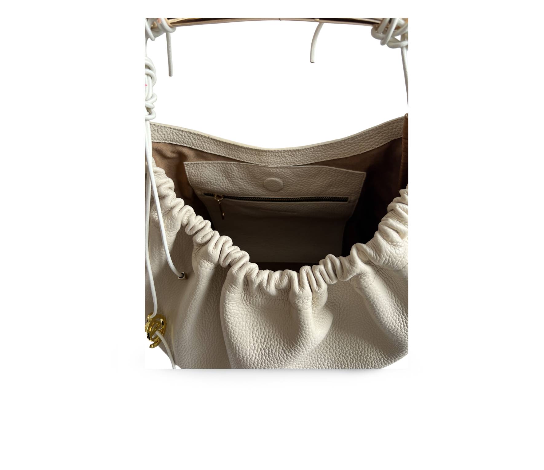Geanta Mermaid Satchel este o geantă relaxată, moale ca untul, realizată manual din piele italiană texturată, sustenabilă. Acest stil simplu conferă o sofisticare lejeră, cu detalii distinctive, încrețite, și un accesoriu de umăr gros, auriu. În interior, un buzunar spațios din piele cu fermoar pentru esențialele zilnice. O închidere magnetică acoperită cu piele asigură siguranța tuturor lucrurilor. Perfectă pentru a-ți găzdui laptopul și toate visele tale.