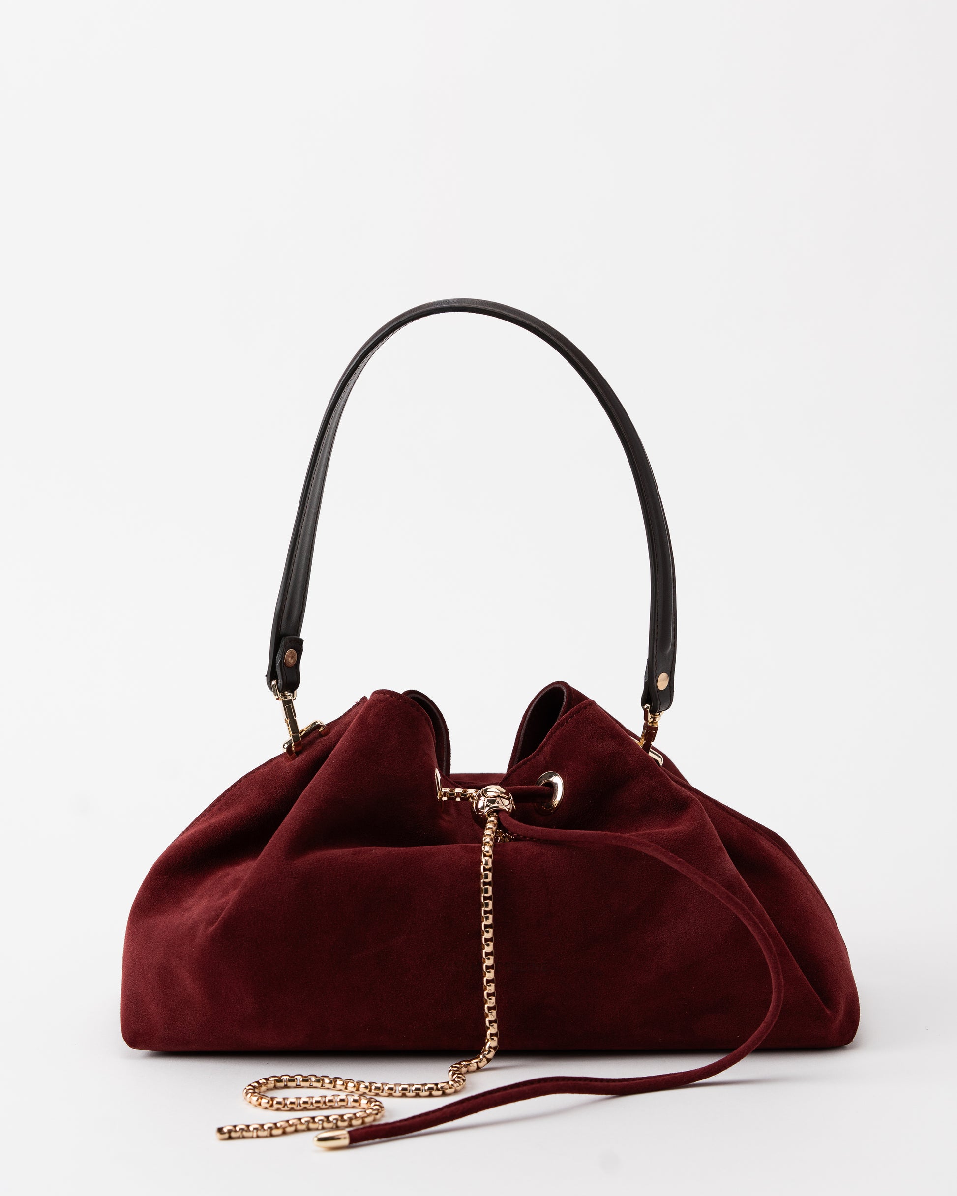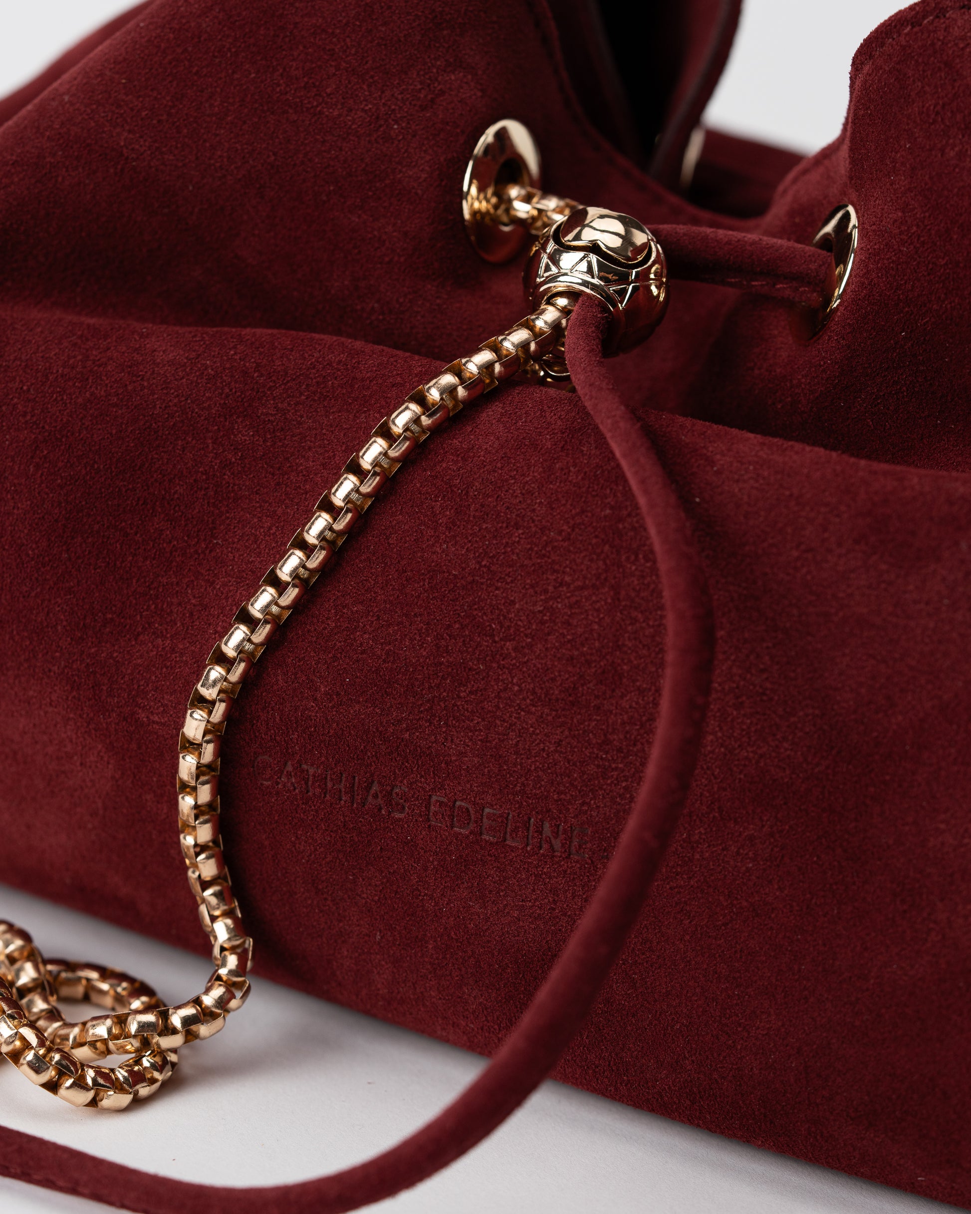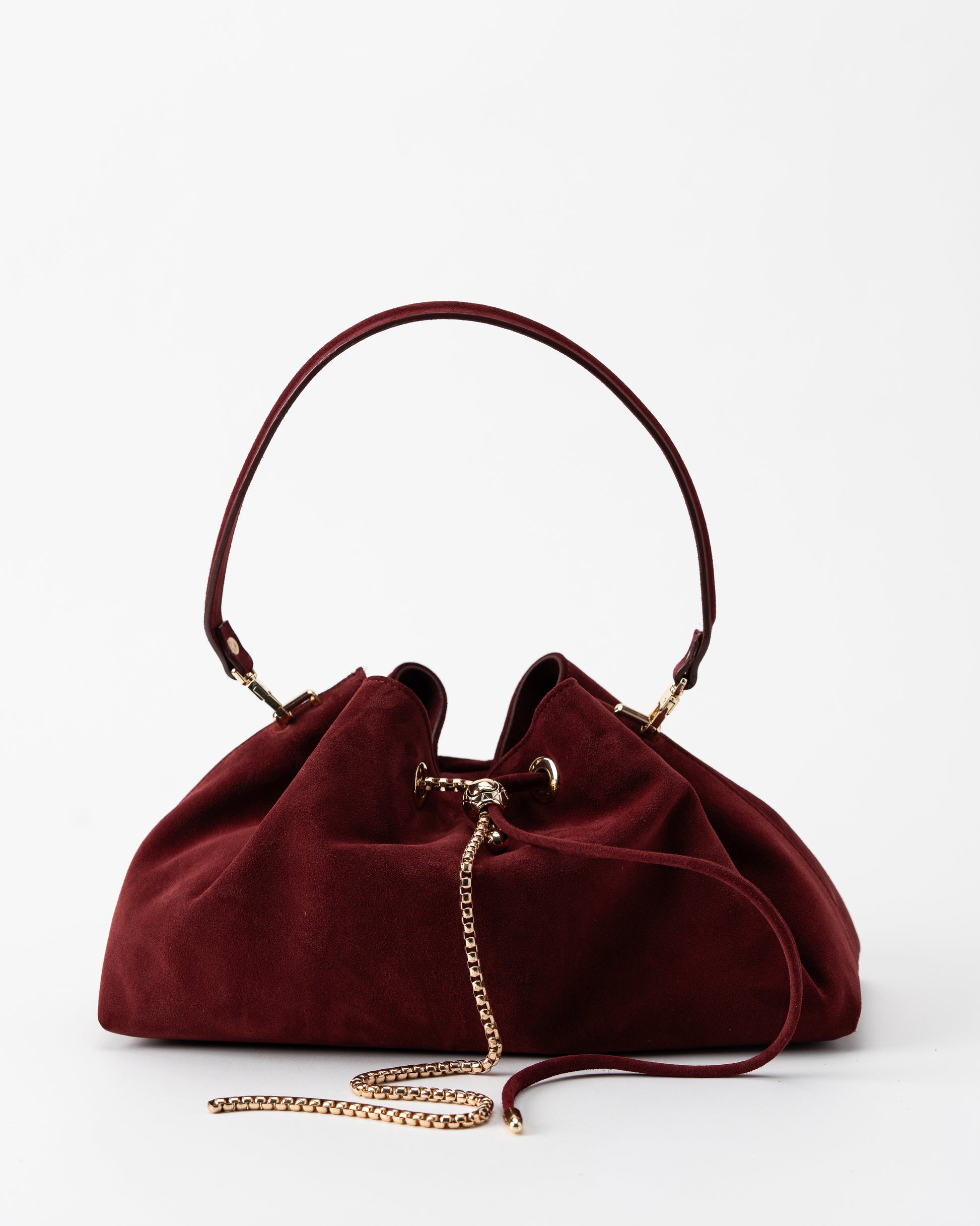 Elegantă și sofisticată, această geantă cu șnur este confecționată din piele întoarsă, cu o siluetă moale și sculpturală. Lanțul auriu și accesoriile lustruite îi sporesc designul rafinat, în timp ce mânerul din piele contrastantă adaugă o notă de caracter modern. Spațioasă, dar șic, este echilibrul perfect între funcționalitate și eleganță.
