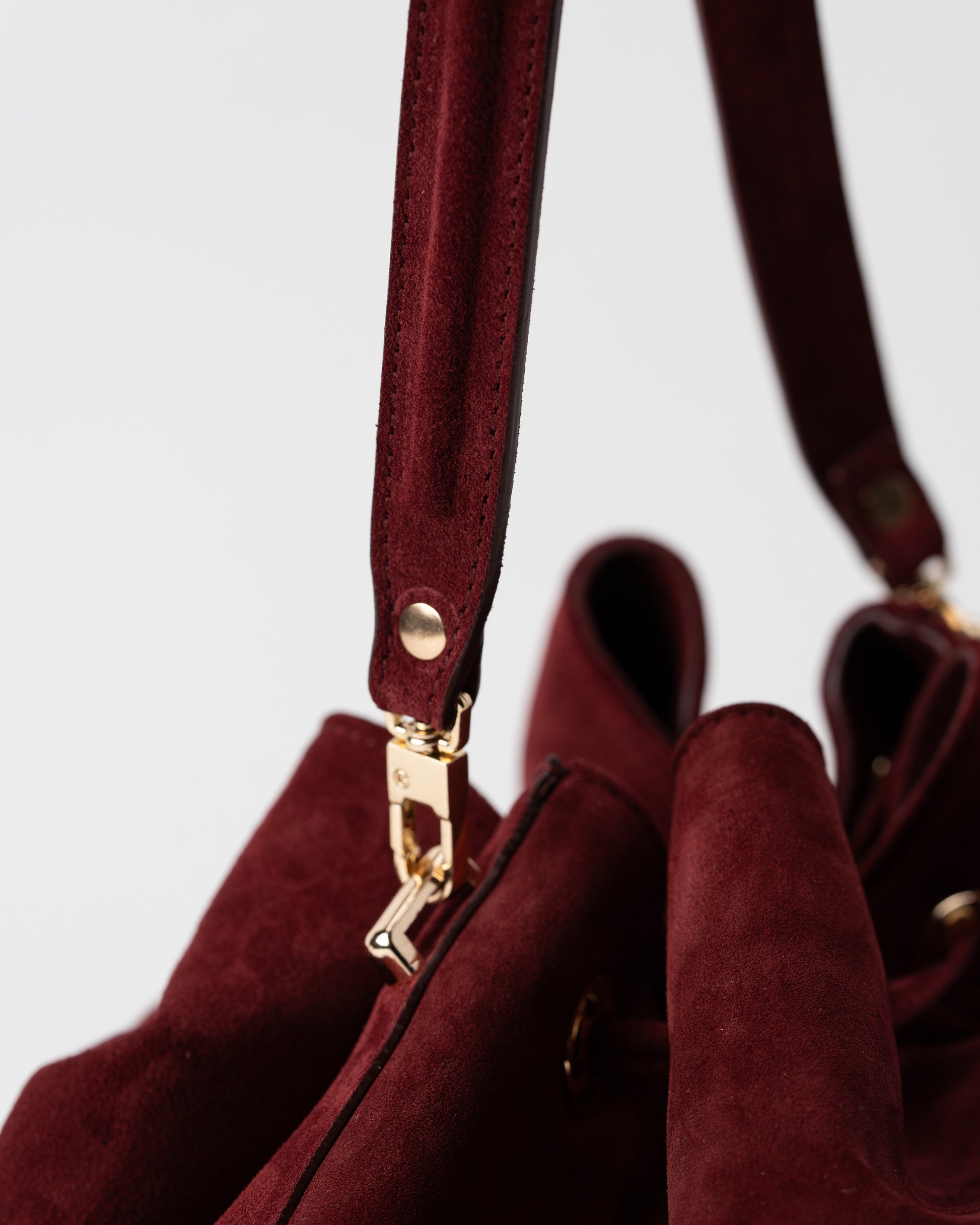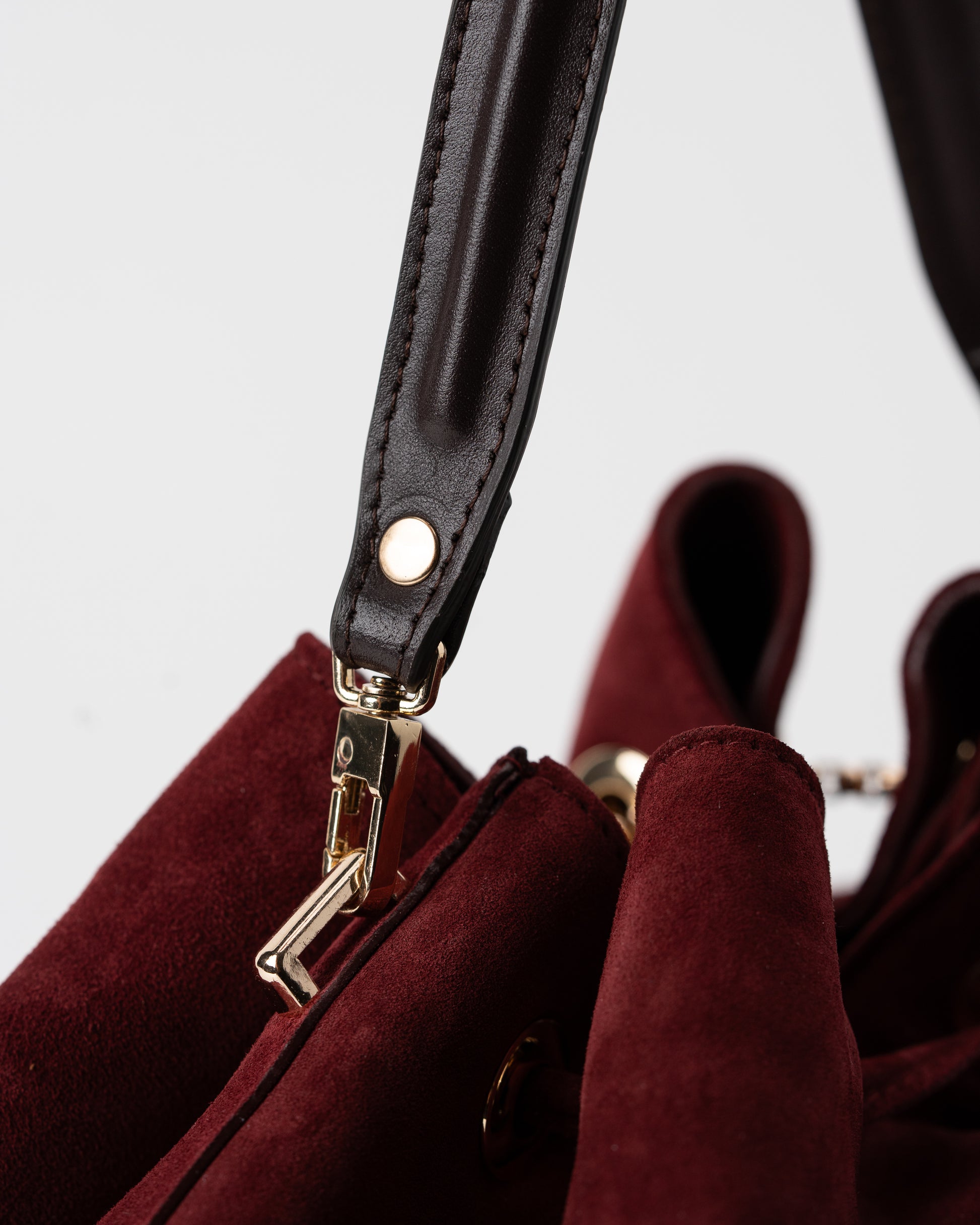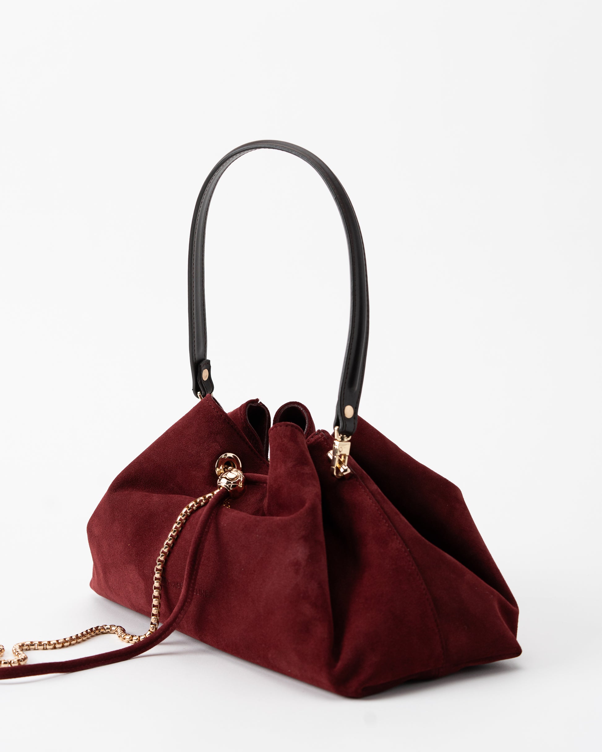 Elegantă și sofisticată, această geantă cu șnur este confecționată din piele întoarsă, cu o siluetă moale și sculpturală. Lanțul auriu și accesoriile lustruite îi sporesc designul rafinat, în timp ce mânerul din piele contrastantă adaugă o notă de caracter modern. Spațioasă, dar șic, este echilibrul perfect între funcționalitate și eleganță.